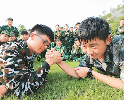 江蘇省贛榆第一中學(xué)新生在軍訓(xùn)間隙進(jìn)行掰手腕比賽。