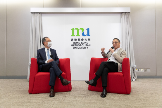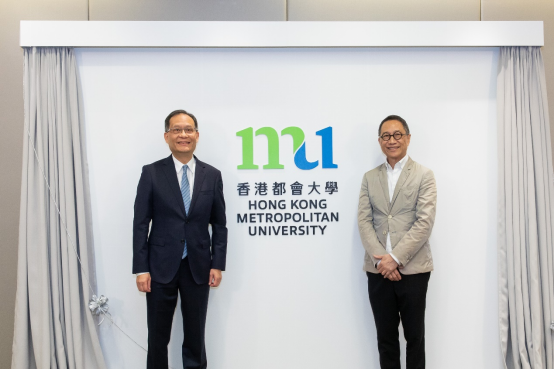 公大校長(zhǎng)林群聲教授(左)與陳幼堅(jiān)設(shè)計(jì)公司始創(chuàng)人兼創(chuàng)意總監(jiān)陳幼堅(jiān)(右)公布香港都會(huì)大學(xué);。