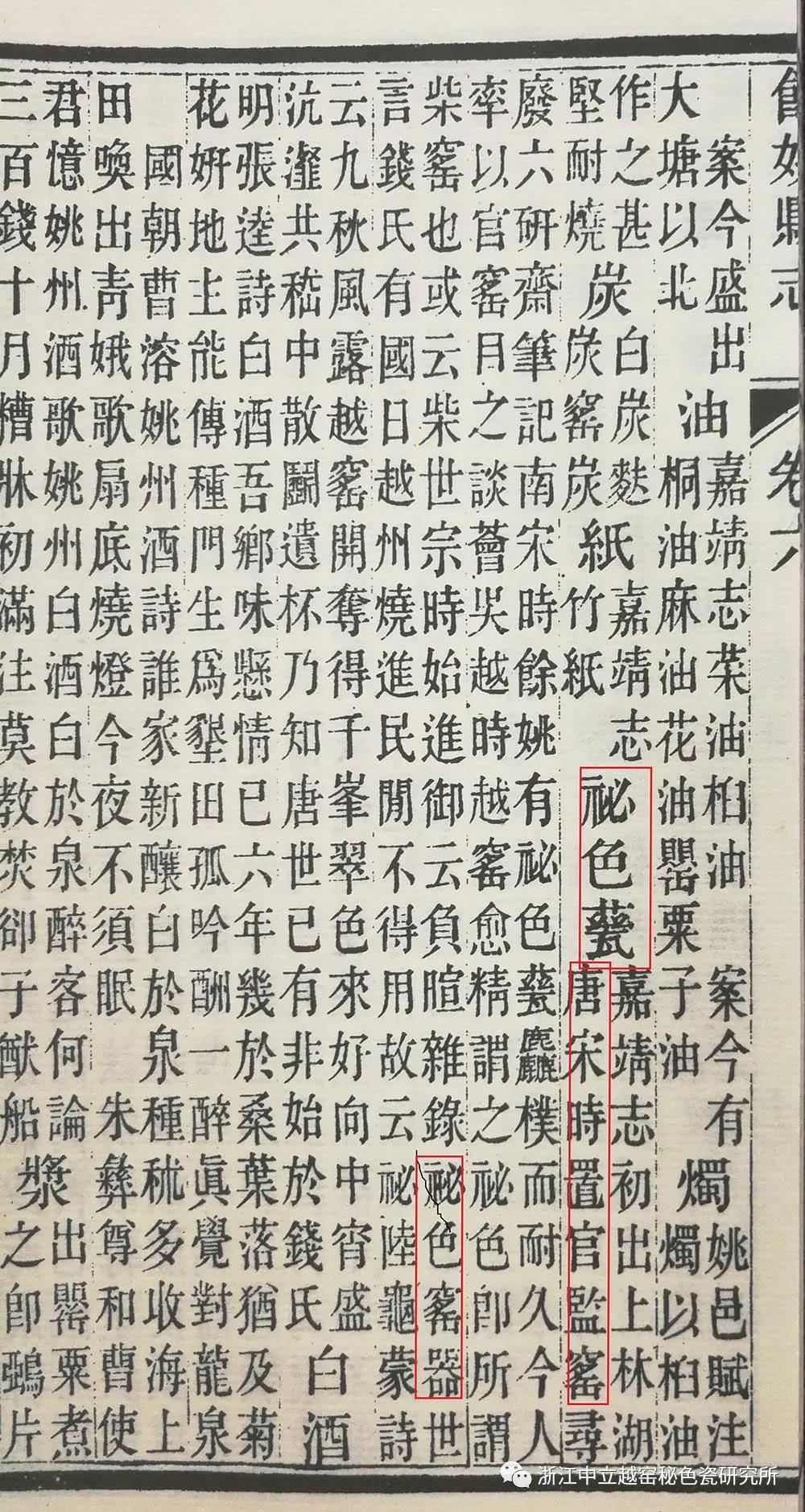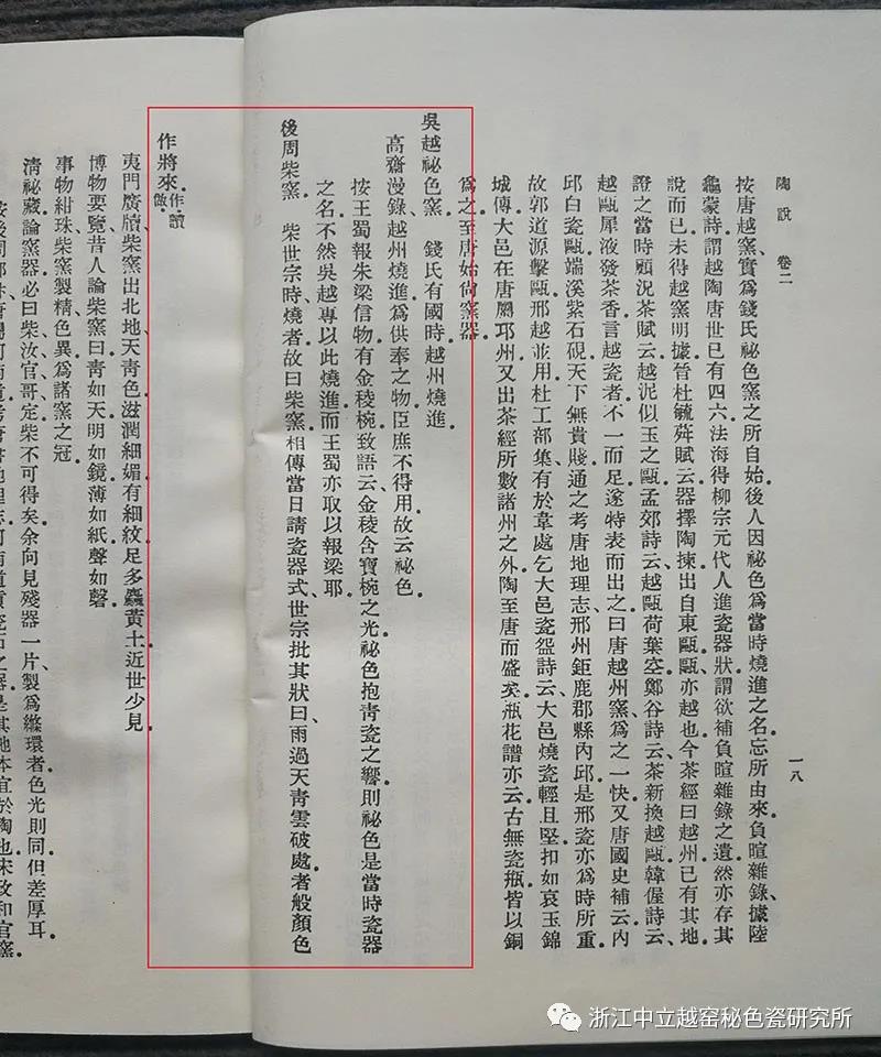 2.《余姚六倉(cāng)志》卷十七錄入宋代顧文薦《負(fù)喧雜錄》《秘色窯》:世言錢(qián)氏有國(guó)日,焼進(jìn),物,民間不得用,故謂秘色。宋怡山《秘色窯》:進(jìn)柴周者刓削尤薄。