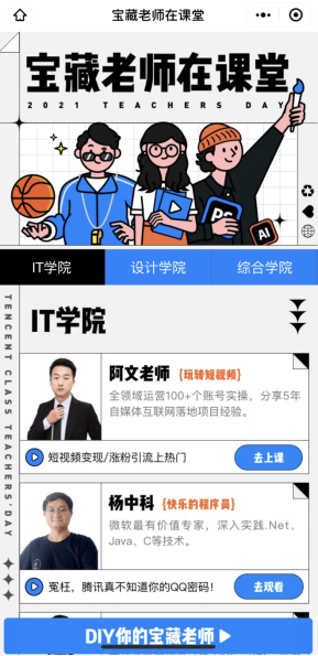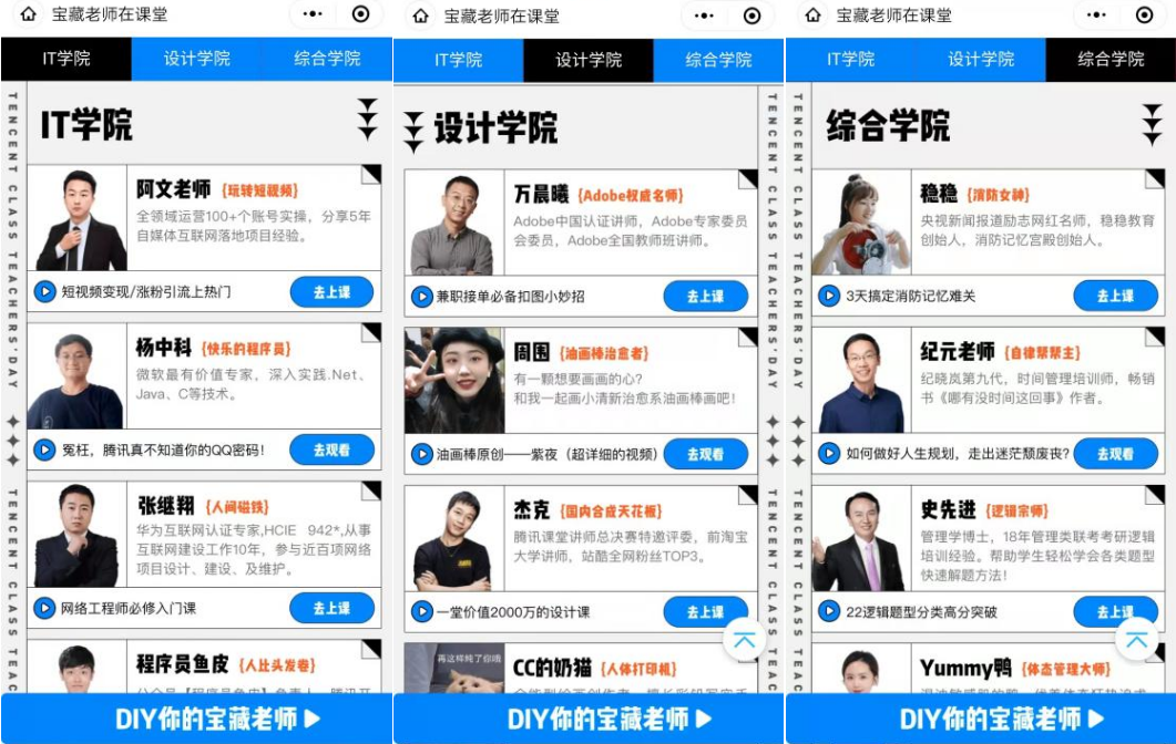 活動期間,用戶登陸騰訊課堂活動專區(qū),即可尋找自己喜歡的老師和觀看喜歡的知識技能視頻,并且通過活動頁面的“DIY你的寶藏老師”拼出自己心目中的好老師。