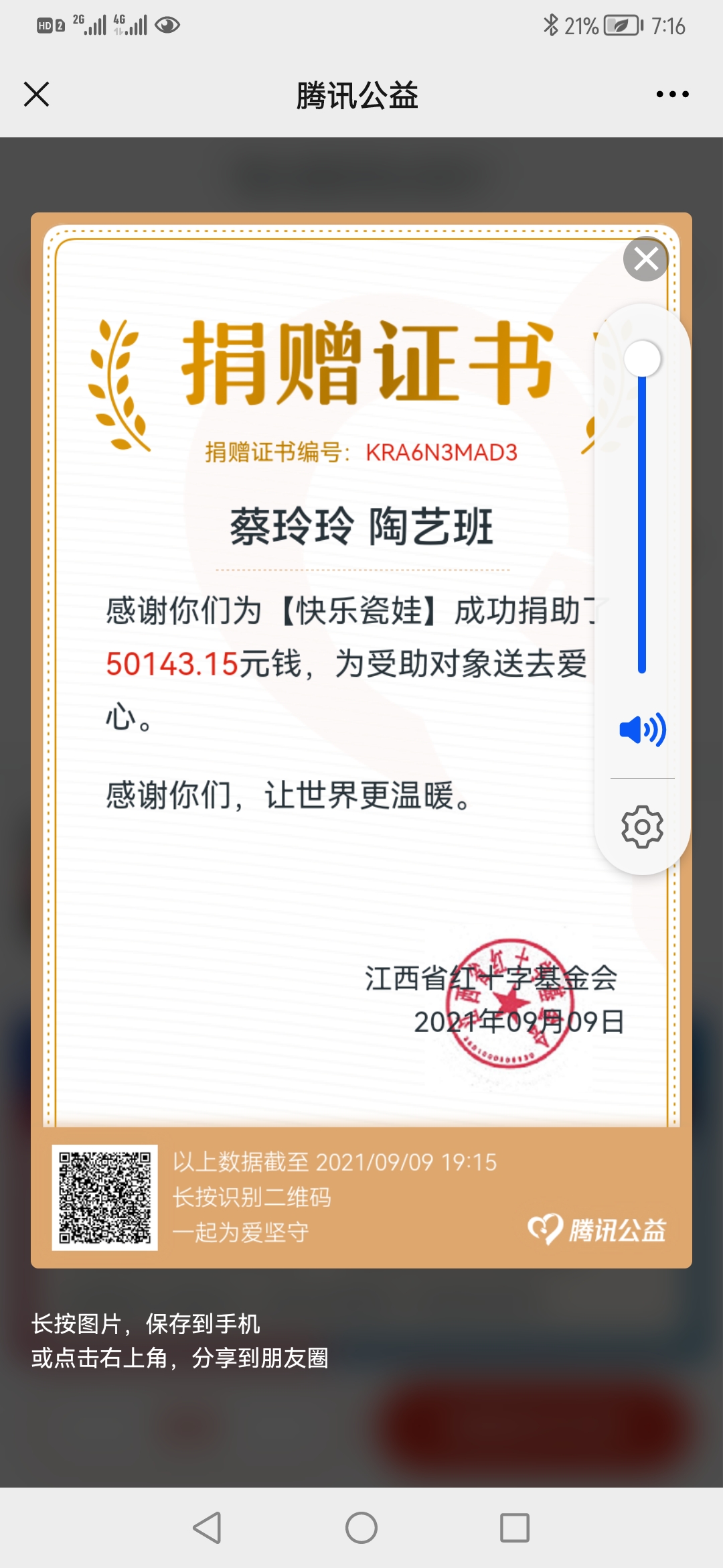 最終,在蔡玲玲團(tuán)隊(duì)的積極參與和大力支持下,快樂(lè)瓷娃項(xiàng)目圓滿(mǎn)完成10萬(wàn)元的籌款任務(wù),而蔡玲玲老師也成為本次99公益日籌款活動(dòng)中捐款最多的個(gè)人,蔡玲玲老師帶著她的籌款團(tuán)隊(duì)表現(xiàn)非常出色,也因此,在瓷善節(jié)致謝儀式上,市紅十字會(huì)黨組書(shū)記俞定珍向蔡玲玲老師頒發(fā)捐贈(zèng)證書(shū),感謝她和她的團(tuán)隊(duì)為快樂(lè)瓷娃所做出的卓越貢獻(xiàn)。