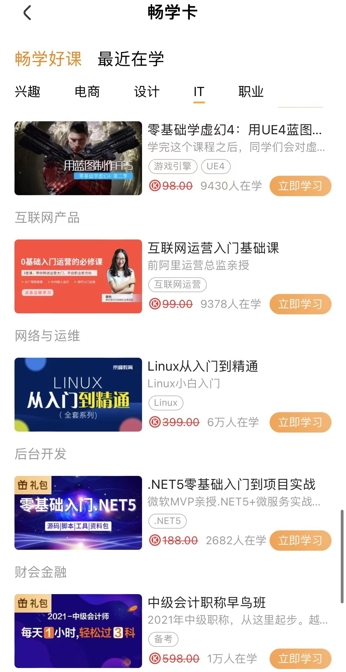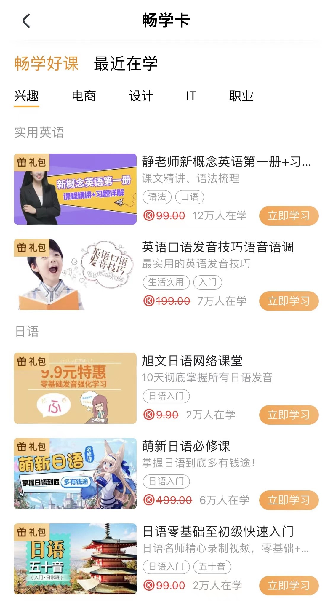 領(lǐng)卡后15天內(nèi),暢學(xué)卡內(nèi)課程均可免費學(xué)習(xí)?▋(nèi)精選了騰訊課堂平臺上優(yōu)質(zhì)的熱門學(xué)習(xí)課程,包含英語、日語、韓語、電商運營、平面設(shè)計、繪畫創(chuàng)作、工業(yè)設(shè)計、前端開發(fā)及編程語言等,充分滿足不同人群的個性化、多元化的學(xué)習(xí)需求。