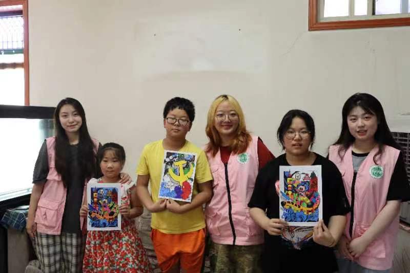 在杜曲街道,實踐團隊成員開展“大手拉小手共慶七一,代代相傳續(xù)紅色基因”系列活動——“革命故事聲聲入耳·聽音繪”音樂團輔黨史科普活動、“百年血脈躍然紙上·七彩繪”牽起你的手彩繪黨史活動,為鄉(xiāng)村困境兒童開展音樂團輔、黨史科普、黨的二十大精神繪畫等活動,將美育和思政課融合,為困境兒童打造以紅色為底色的“七彩假期”。