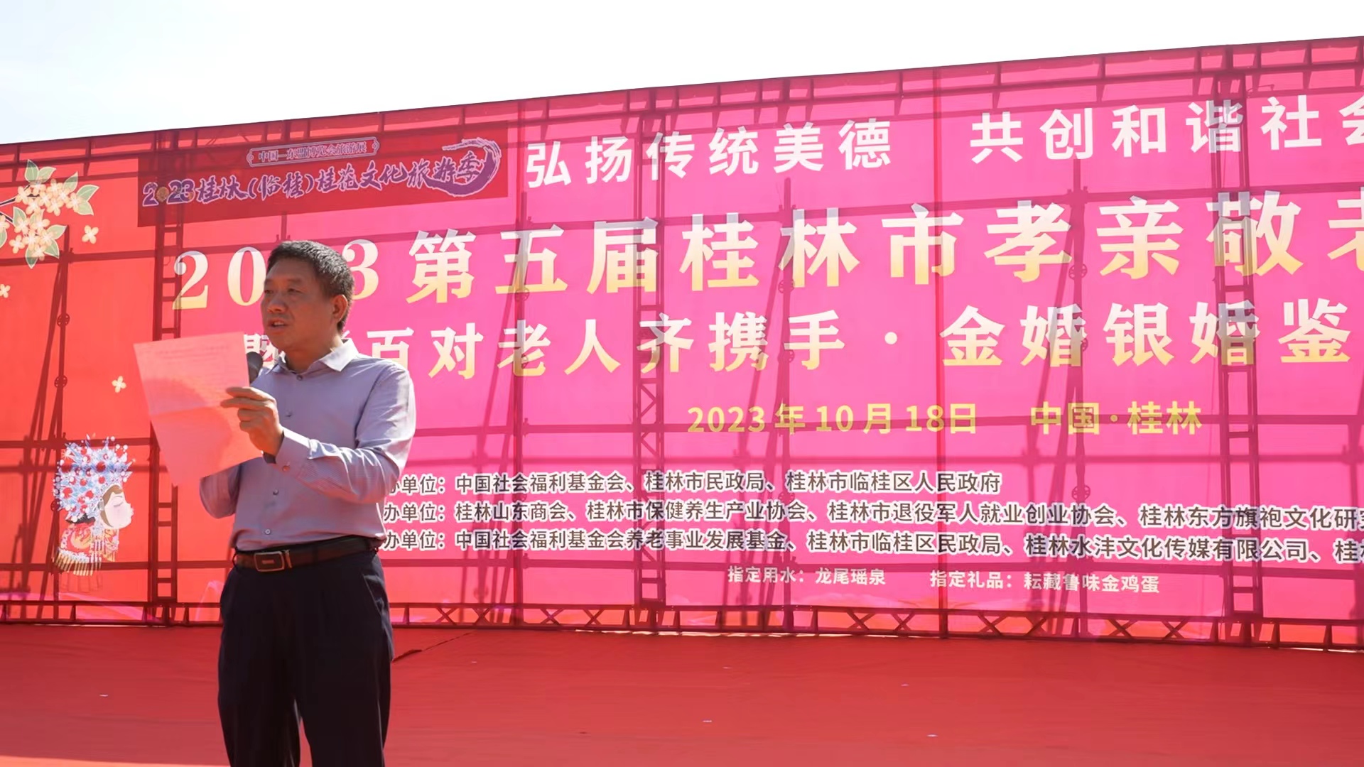 金秋送爽,桂花飄香,孝親敬老,情深誼長。在喜迎2023年九九重陽節(jié)暨我國法定第11個老年節(jié)到來之際,由中國社會福利基金會主辦,中國社會福利基金會養(yǎng)老事業(yè)發(fā)展基金承辦的“百對金婚銀婚·鑒真情”孝親敬老系列公益活動,在桂林市民政局、臨桂區(qū)人民政府及臨桂區(qū)民政局等單位的大力支持以及愛心企業(yè)和公益志愿者的積極參與下,隆重舉行。