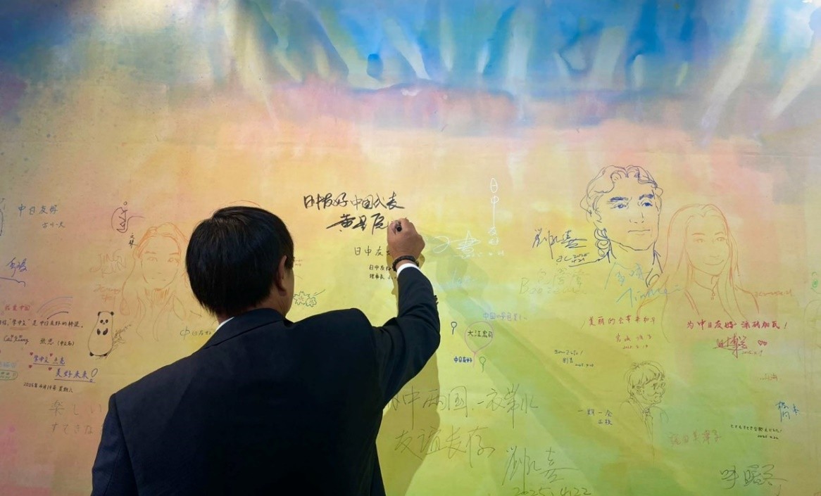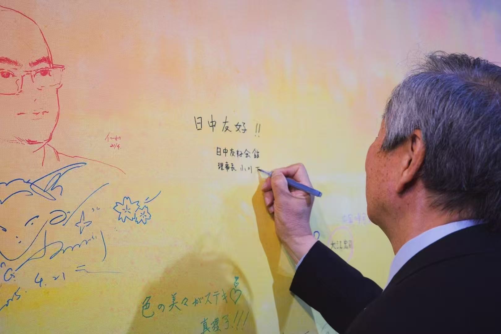 日中友好會(huì)館理事長小川正史,中國資深外交官、日中友好會(huì)館大使銜中方代表理事黃星原先生以及日中友好協(xié)會(huì)副會(huì)長永田哲二簽名并寫下了“日中友好”的美好祝愿。