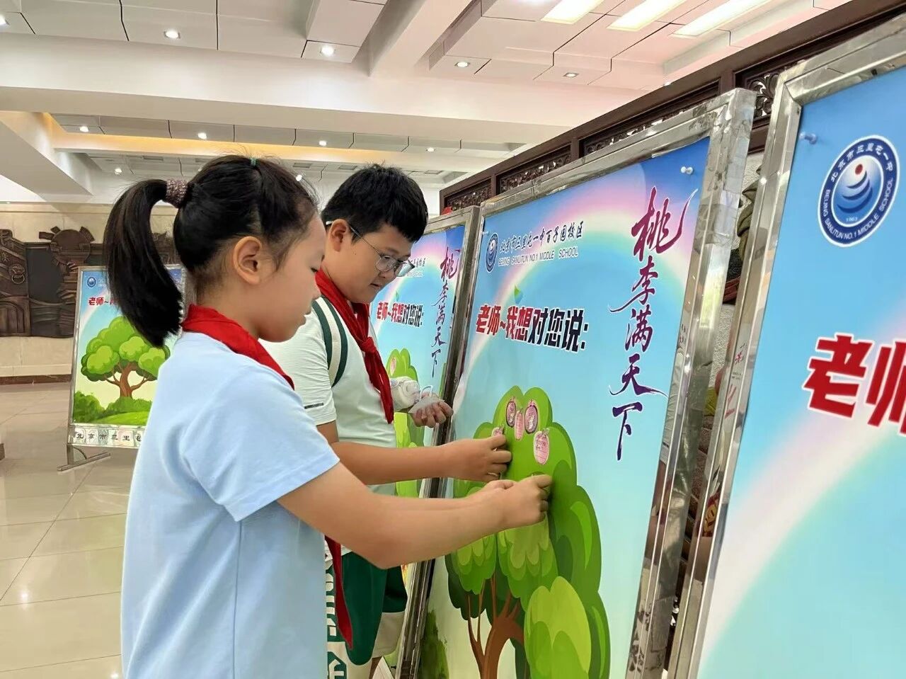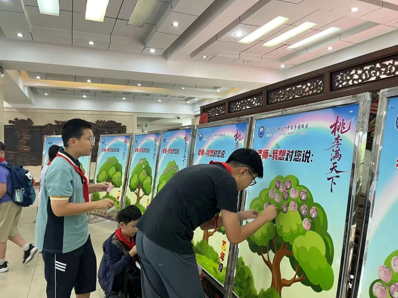 清晨,當?shù)谝豢|陽光灑進校園,校門口早已是一片熱鬧而溫馨的景象。全校學生手持精心準備的桃子、李子形狀小貼紙,臉上洋溢著燦爛的笑容,有序地步入校園。他們紛紛將寫滿對老師感恩話語和美好祝福的小貼紙,鄭重地貼在各個年級的桃樹、李樹上。不一會兒,桃樹、李樹便掛滿了學生們的心意,仿佛在訴說著師生間深厚的情誼,“桃李滿天下”的美好寓意在這一刻生動呈現(xiàn)。