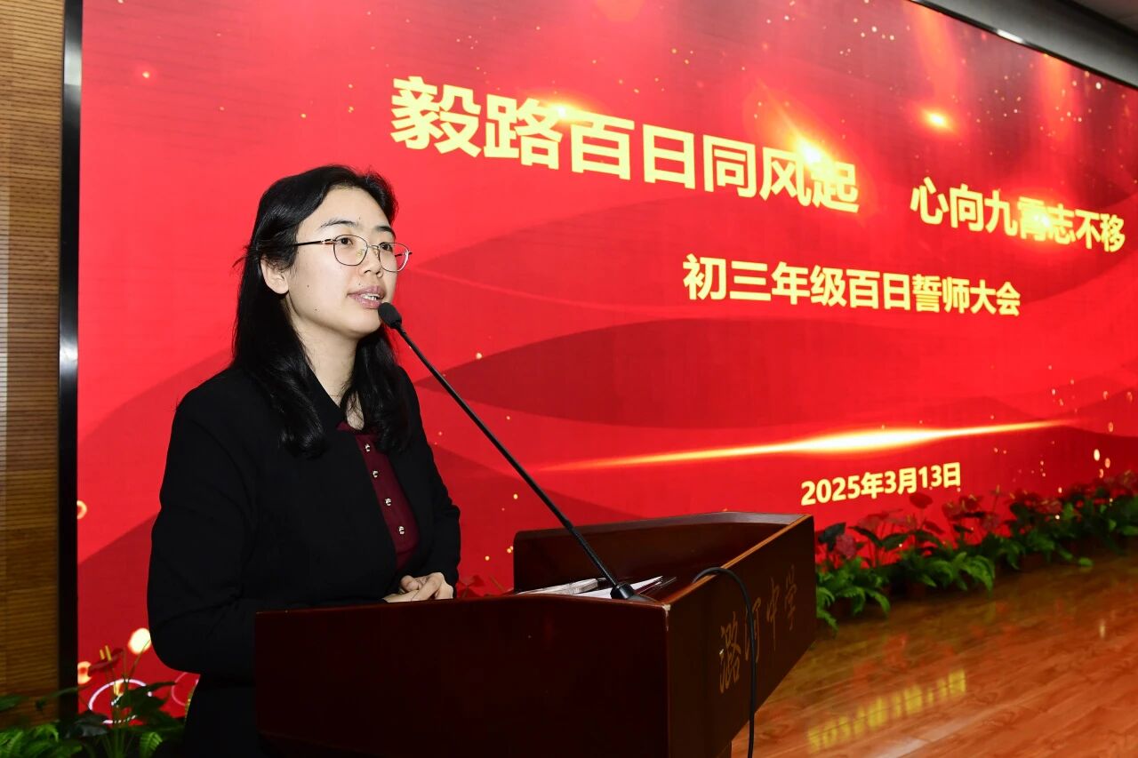 接下來(lái),初三教師團(tuán)隊(duì)以詩(shī)朗誦《百日征途,與你并肩》傾吐心聲。三尺講臺(tái)上的引路人化身為追夢(mèng)守護(hù)者:"做永不熄滅的火把,照亮你們前行的花路!"鏗鏘的詩(shī)句與經(jīng)久不息的掌聲交織,為學(xué)子注入奮進(jìn)的力量。