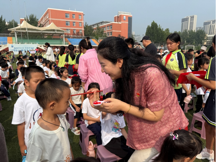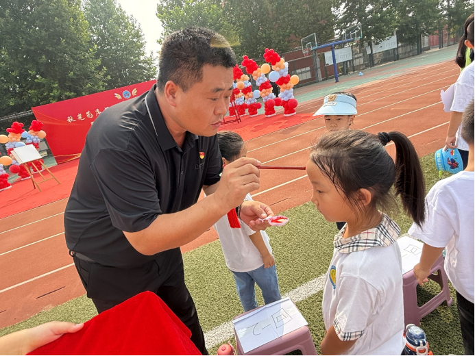 沐金風,杏壇披錦繡;唷清韻,學子譜新篇,F(xiàn)場的領(lǐng)導及老師們?yōu)?00余名可愛的一年級新生點朱砂,祝愿他們眼明心亮,奮發(fā)向上。