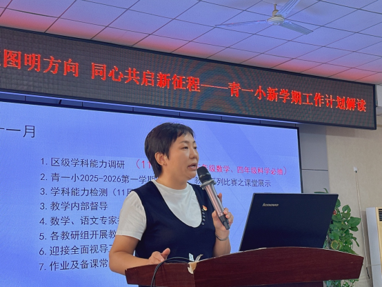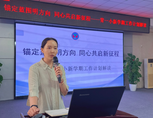教導處主任王娜以時間為軸,從課賽安排、教研活動、內(nèi)部督導、專家指導課、學業(yè)檢測、人工智能教育等方面,展開解讀新學期教學工作安排,明確“聚焦教學提質(zhì) 深化研修實效”教學任務,為教師專業(yè)發(fā)展與教學質(zhì)量提升提供指引。