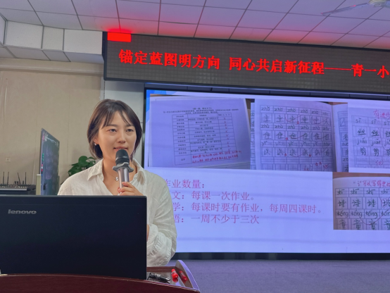 教導處副主任馬郡以“優(yōu)化常規(guī)管理 促教學常態(tài)提質(zhì)”為題,從教學常規(guī)(教案要求、作業(yè)要求)、跨學科學習和閱讀三方面進行詳細的工作解讀,并用鮮明的例子對要求進行解答,要求全體教師做到“有標準、有檢查、有反饋”,為學生健康發(fā)展提供更多可能。