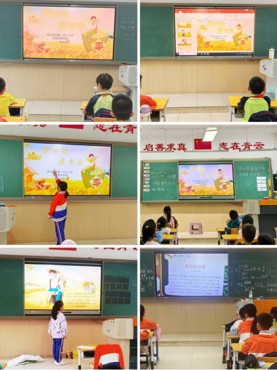 在班會(huì)上,班主任老師帶領(lǐng)學(xué)生了解秋分節(jié)氣和我國(guó)設(shè)立農(nóng)民豐收節(jié)的重要意義,體會(huì)農(nóng)民伯伯的辛苦付出,培養(yǎng)學(xué)生尊重勞動(dòng)和熱愛勞動(dòng)的品質(zhì)。同學(xué)們專注聆聽,在知識(shí)傳遞中感受豐收的喜悅與勞動(dòng)的美好,開啟了豐收節(jié)的精彩篇章。