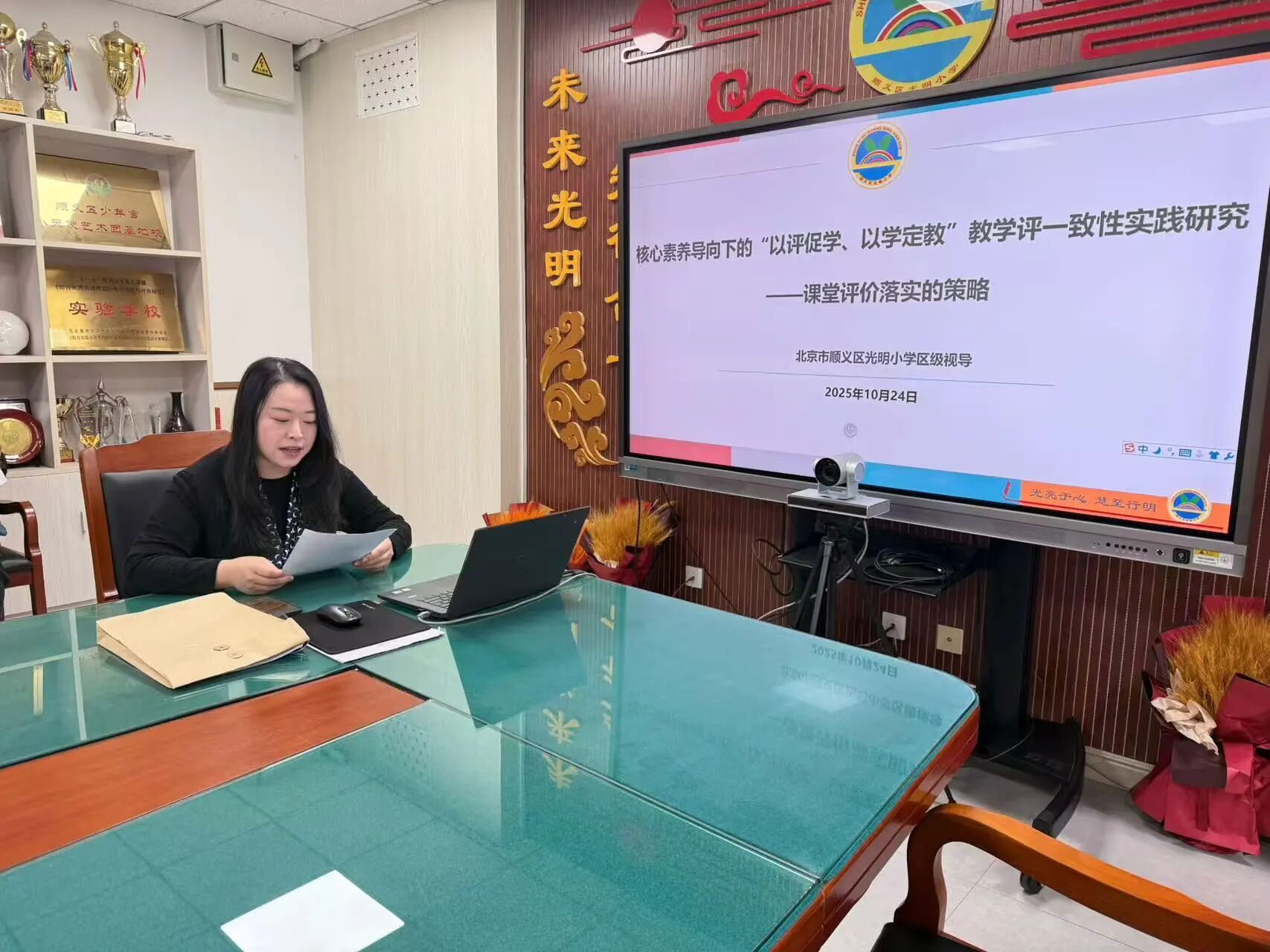 活動(dòng)伊始,學(xué)校教學(xué)干部馮娜主任以 “核心素養(yǎng)導(dǎo)向下的‘以評(píng)促學(xué)、以學(xué)定教’教學(xué)評(píng)一致性實(shí)踐研究 —— 課堂評(píng)價(jià)落實(shí)的策略” 為主題,全面匯報(bào)我校教學(xué)與教研工作。她從教學(xué)管理改革、作業(yè)管理優(yōu)化、教師培養(yǎng)賦能、質(zhì)量評(píng)估創(chuàng)新等多維度,系統(tǒng)闡述學(xué)校在提升教育教學(xué)質(zhì)量上的深度思考與扎實(shí)行動(dòng)。