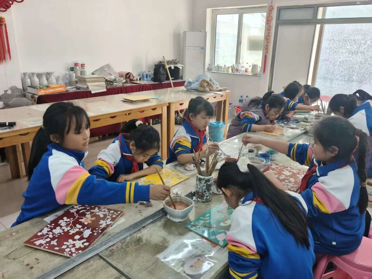 動(dòng)手體驗(yàn)環(huán)節(jié)掀起熱潮,彩繪陶盆、繪制粉彩瓷板、陶藝泥塑三項(xiàng)體驗(yàn)遵循“視頻教學(xué) + 教師指導(dǎo)”模式。同學(xué)們先認(rèn)真觀摩教學(xué)視頻學(xué)習(xí)技巧,在專業(yè)教師點(diǎn)撥下動(dòng)手實(shí)踐。精心繪制陶盆,揉捻陶泥時(shí)專注投入,勾勒瓷板時(shí)小心翼翼,每一道紋路、每一抹色彩都傾注著童真創(chuàng)意。活動(dòng)尾聲,師生們共同合影留念,同學(xué)們帶著親手繪制的陶盆滿載而歸。此次活動(dòng)讓孩子們體驗(yàn)了陶藝創(chuàng)作的樂趣,更在心中播下了傳承中華優(yōu)秀傳統(tǒng)文化的種子。