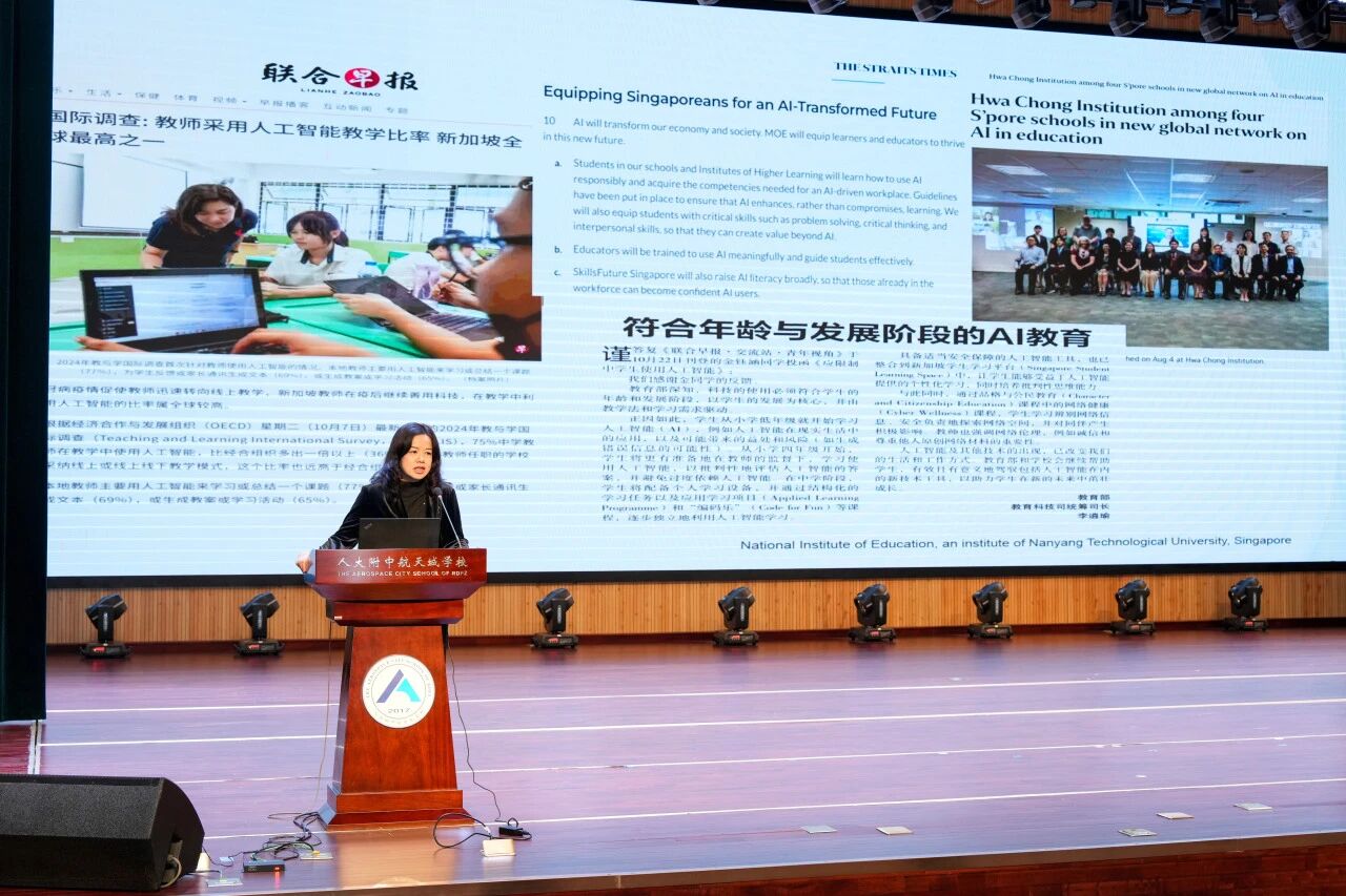 特邀報告環(huán)節(jié),來自新加坡南洋理工大學(xué)、國家教育咨詢委員會、海淀區(qū)教委、人大附中航天城學(xué)校的教育工作者,分別從核心理念、政策導(dǎo)向、區(qū)域?qū)嵺`、課堂探索的緯度,分享了以人工智能推動教育現(xiàn)代化的探索和經(jīng)驗。