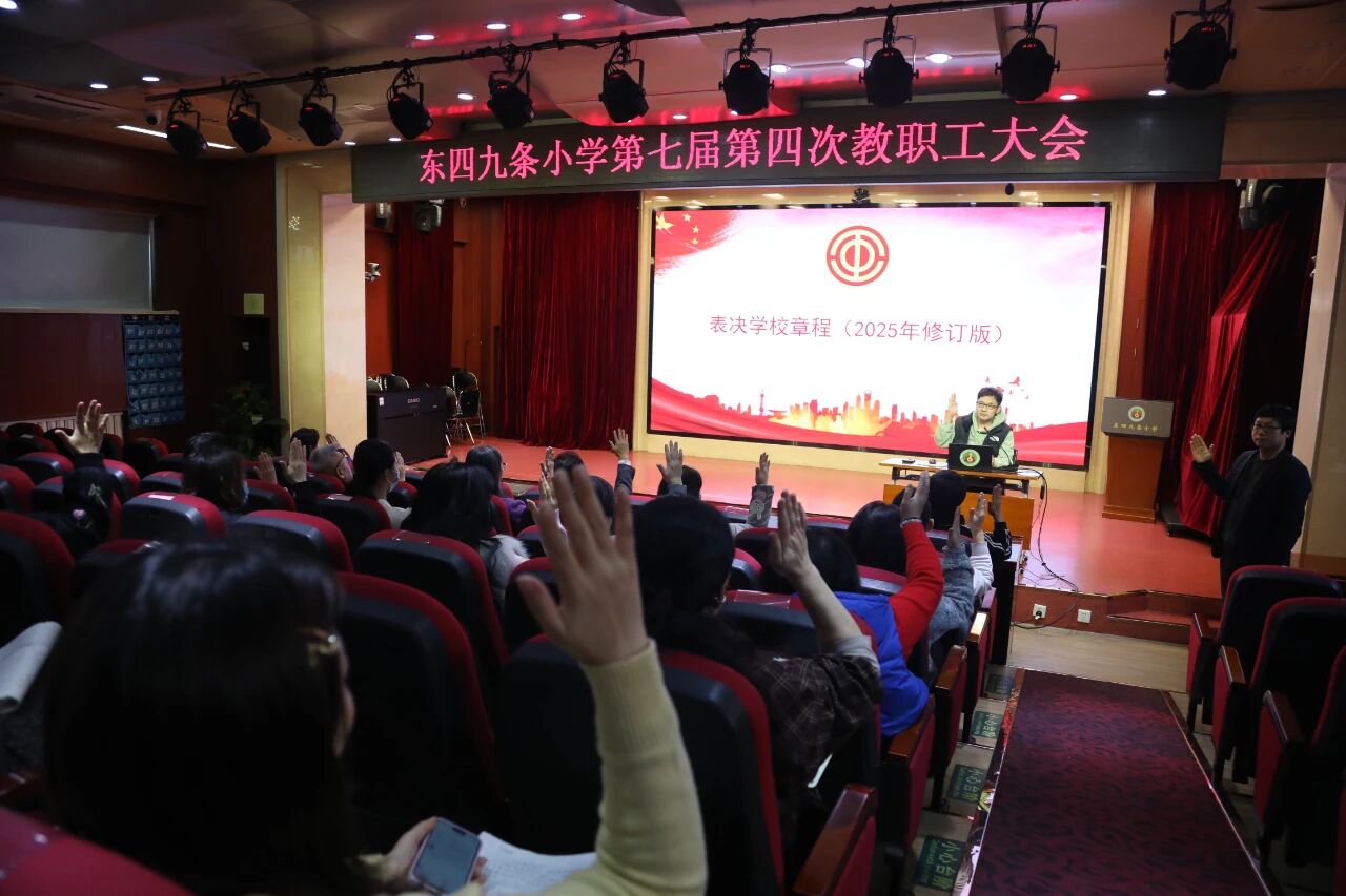 2025年12月16日下午,東四九條小學(xué)召開第七屆第四次教職工大會,表決通過2025年修訂版學(xué)校章程。會前,學(xué)校書記校長王鳳嶺責(zé)成德育副校郭京京圍繞相關(guān)科室下達(dá)的修改意見逐條修改。支委魏冕主任和書記校長先后進(jìn)行嚴(yán)格審核。并將修訂版通過工作群向全體老師進(jìn)行發(fā)布,學(xué)習(xí)并討論。在學(xué)校黨支部組織會議和校長辦公會會議進(jìn)行專題討論。為學(xué)校教職工大會順利表決通過做了充分準(zhǔn)備。學(xué)校章程是學(xué)校師生依法行使權(quán)力的根本保障。學(xué)校工會主席主持了今天的會議,并就相關(guān)修改進(jìn)行了說明,隨后書記校長就校章的地位和作用進(jìn)行了重點(diǎn)解讀。
