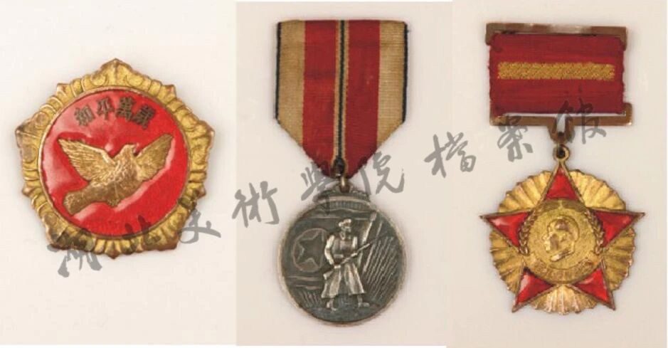 從左到右依次為:中國政府頒發(fā)的中國人民赴朝慰問團贈予志愿軍的“和平萬歲”紀念章、朝鮮政府頒贈的中國人民志愿軍軍功章、中國政府頒發(fā)的抗美援朝紀念章