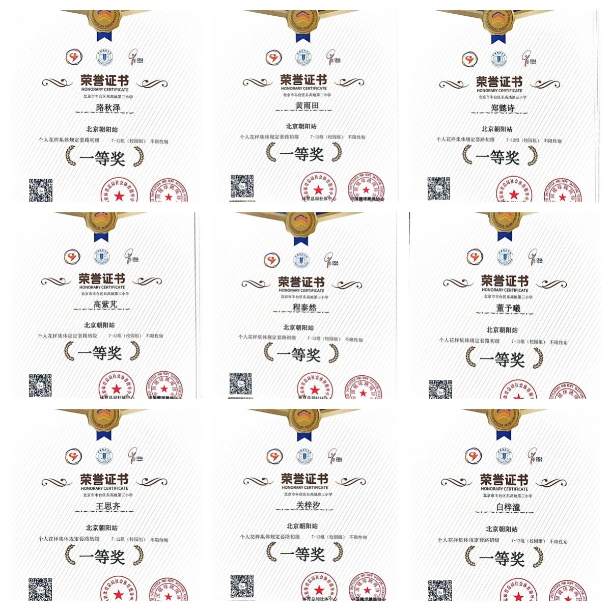 一、二年級的競速跳繩比賽更是萌趣十足。小選手們雙手緊握繩柄,雙腳輕輕起跳,繩子在腳下快速穿梭,像一道道彩色的弧線。有的同學(xué)雖然動作略顯稚嫩,但眼神格外堅定,即使不小心絆到繩子,也立刻調(diào)整狀態(tài)重新起跳。經(jīng)過多輪激烈角逐,各年級分別決出了冠、亞、季軍,同時根據(jù)班級整體表現(xiàn)評選出了團(tuán)體第一、二名。當(dāng)獎狀送到手中時,小選手們的臉上都綻放出了燦爛的笑容。