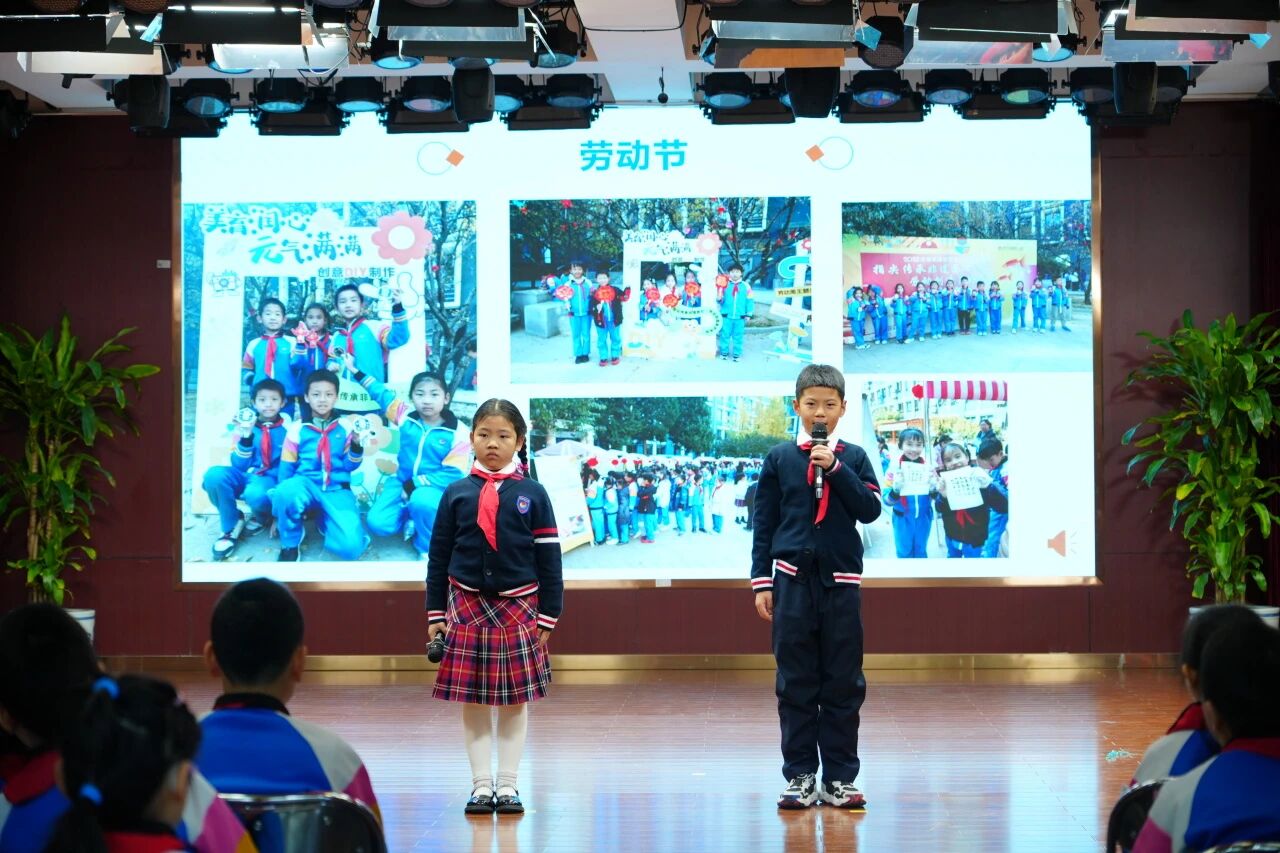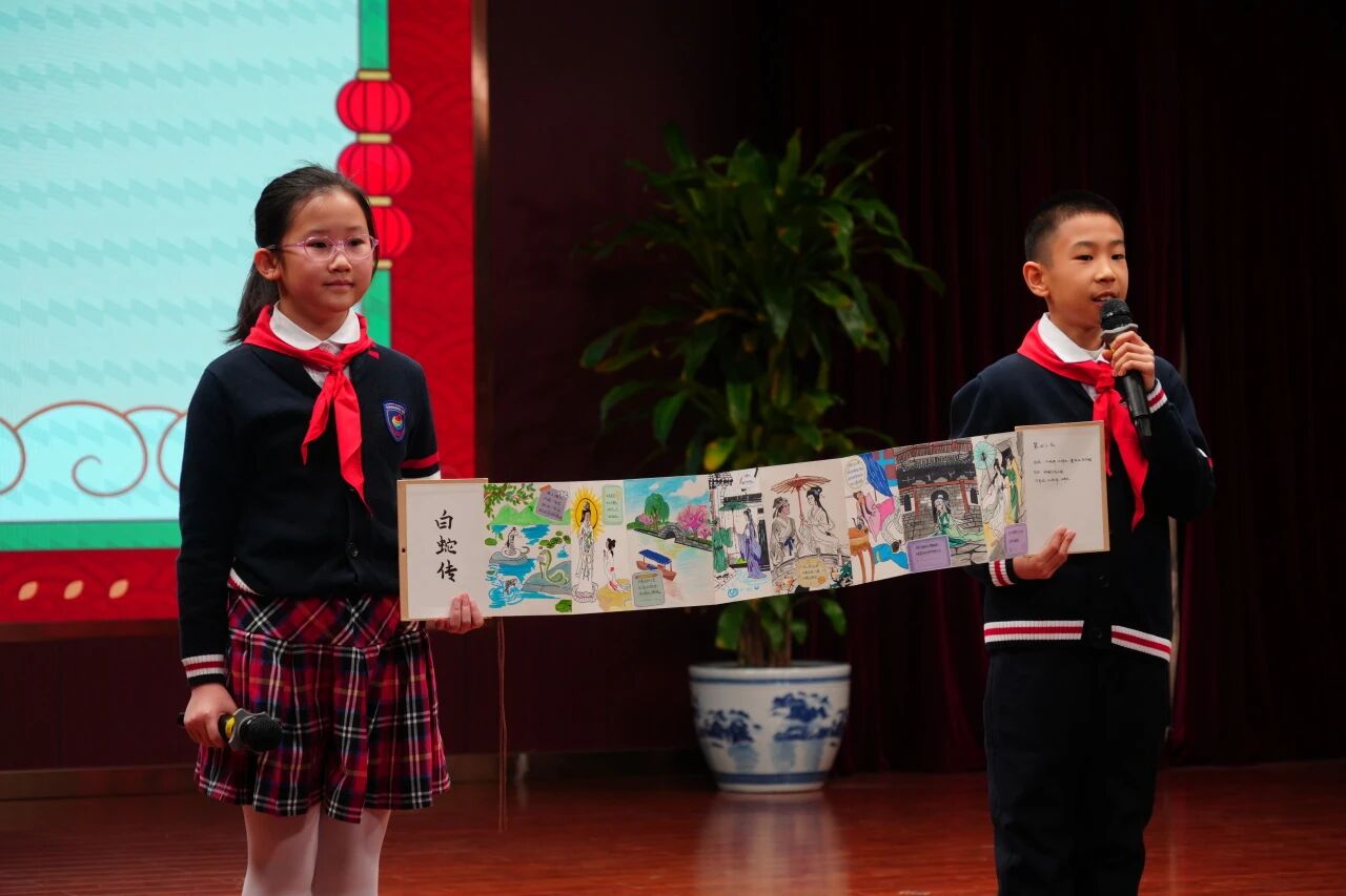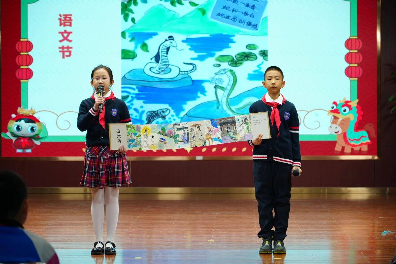 在學(xué)科與實(shí)踐活動(dòng)收獲分享環(huán)節(jié),同學(xué)代表們依次登臺,暢談在語文節(jié)、英語節(jié)、勞動(dòng)周中的親身經(jīng)歷與深刻感悟。從繪制《白蛇傳》連環(huán)畫的奇妙過程,到英語交流中的自信表達(dá),再到非遺活動(dòng)中的沉浸體驗(yàn),每個(gè)片段都記錄著同學(xué)們的收獲與進(jìn)步。