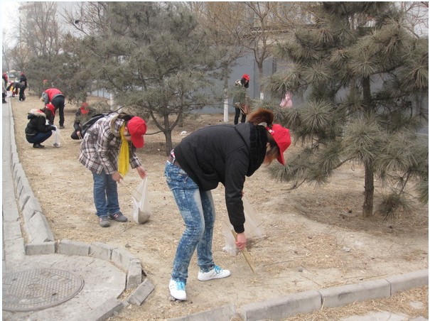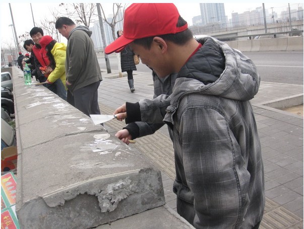 本次服務(wù)活動(dòng)地點(diǎn)位于芍藥居三、四社區(qū)和地鐵13號(hào)線芍藥居站外墻。志愿小組分為三個(gè)小組,組長(zhǎng)們帶著各自的隊(duì)員領(lǐng)了鏟子、刷子和夾子,帶著塑料袋,熱火朝天的勞動(dòng)起來。有的同學(xué)在小區(qū)的圍墻邊開始清理貼在地上和墻上的小廣告;有的同學(xué)在社區(qū)周邊的道路上,在公交車站旁撿拾白色垃圾;有的同學(xué)在社區(qū)周邊的路口,幫助交通協(xié)管員糾正行人闖紅綠燈,亂穿馬路等不文明行為。晚冬的北京,寒冷依舊,志愿者們頂著刺骨的寒風(fēng),不顧小手的通紅,刺鼻的氣味,在來來往往的行人中,默默的踐行著雷鋒精神。