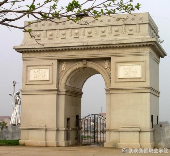 凱旋門當(dāng)大門、美國(guó)白宮當(dāng)教學(xué)樓、埃及金字塔作圖書館、希臘眾神像圍成水池、還有凱旋門、自由女神像、斯芬克斯像......這不是網(wǎng)絡(luò)上虛擬的谷歌地球,也不是世界公園里的微型模型,這些建筑都實(shí)實(shí)在在的存在在湖北武漢商貿(mào)職業(yè)學(xué)院里面。