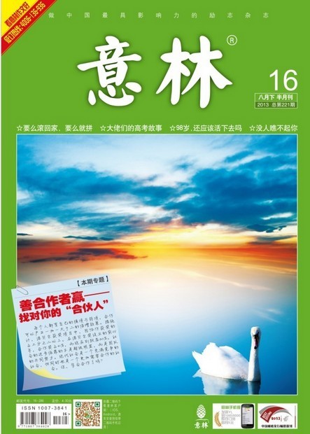 由國家新聞出版廣電總局主辦的2013年“百強報刊”評選活動歷經(jīng)三個月的推薦和票選,9月14日,在武漢期刊交易博覽會上正式公布結(jié)果,《意林》雜志首次入選 “全國百強報刊”。