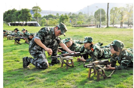 對策2:比做俯臥撐 “我們有合唱比賽,也有社團宣傳,還有9·18紀念日的時候有個活動:為了記住國恥,我們每個人都做了30個俯臥撐。其實做30個俯臥撐對我們來說很多,但大家都硬撐著做完了。”湖南師范大學的新生陳夢在言談間已有一種大學生的堅定!败娪柊盐覀兌甲兂闪恕疂h子’,累是必然的,那些動作做齊還是蠻難的,不過也還好,同學在一起很開心!薄拔覀冞打靶了,真槍實彈,很激動很過癮,有同學還撿了彈殼做留念。”