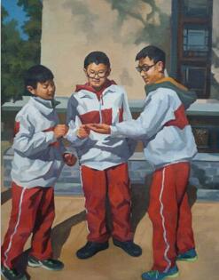 曾經(jīng)有位前輩告訴我,美術(shù)老師時(shí)刻不能丟下自己的畫筆,否則就對(duì)不起自己的職業(yè)。課余時(shí)間,我總是拿著速寫本,穿梭在農(nóng)家的大街小巷,或是蹲在田間地頭仔細(xì)觀察。青色的玉米、纏繞的瓜藤、紅彤彤的柿子都成了我創(chuàng)作的素材。為了方便攜帶畫具,我買了一輛三輪電動(dòng)車,騎著它沿著運(yùn)河一路下行,到較遠(yuǎn)的地方去寫生。慢慢地,我畫室里積累的作品越來越多。創(chuàng)作離不開自己的生活環(huán)境。作為一名教師,我每天的生活離不開熟悉的校園,離不開每一個(gè)學(xué)生,校園中有那些可敬的教師、朝氣蓬勃的學(xué)生,他們的每一個(gè)生活細(xì)節(jié)都深深地烙在我心里。我想用畫筆把我捕捉到的動(dòng)人瞬間記錄下來,用畫作來詮釋他們的美!多l(xiāng)村教師》《今天我值周》《甘為孺子牛》……課堂上,我用自己的獲獎(jiǎng)作品作為范畫,讓學(xué)生欣賞,給他們講述創(chuàng)作的過程。我發(fā)現(xiàn)孩子們逐漸喜歡上了美術(shù)課,學(xué)習(xí)美術(shù)的積極性逐漸增強(qiáng)。